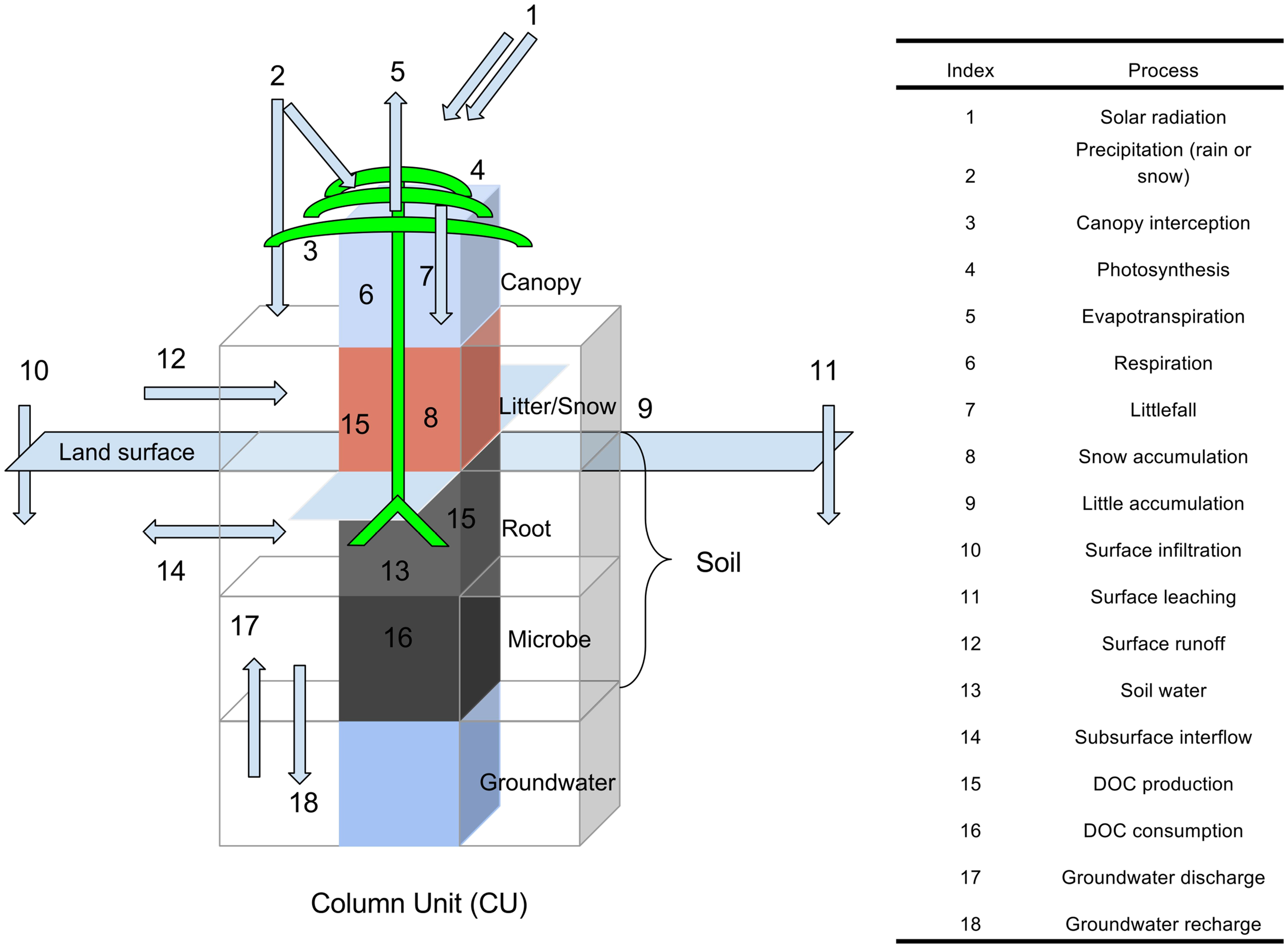 Figure. Water and carbon cycle processes simulated by the ECO3D model for a land column unit. Green lines and curves represent the vegetation. Blue arrows with indices represent key carbon and hydrological processes listed in the rightside table. The ECO3D model was developed based on a spatially distributed hydrological model, Precipitation Runoff Modeling System (PRMS) (Leavesley et al., 1983), and a process‐based biogeochemistry model, Terrestrial Ecosystem Model (TEM) (Zhuang et al., 2003). (Liao et al., 2019).