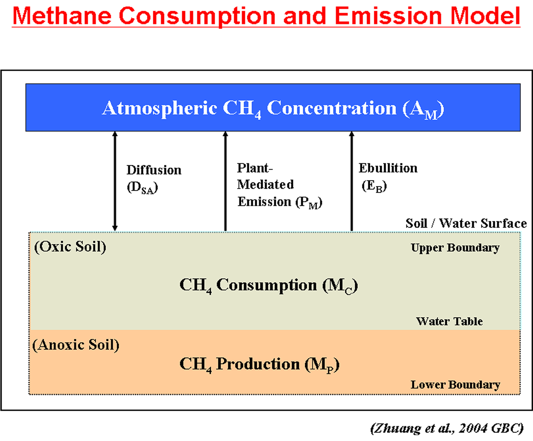 As the original version of the HM is designed to simulate water dynamics only in upland soils, algorithms have also been added to simulate water dynamics in wetland soils. For wetlands, the soil profile is divided into two zones based on the water table depth: 1) an oxygenated, unsaturated zone; and 2) an anoxic, saturated zone. The soil water content and the water table depth in these wetland soils are determined using a water-balance approach that considers precipitation, runoff, drainage, snow melt, snow sublimation, and evapotranspiration. We assume that wetland soils are always saturated below 30 cm, which represents the maximum water table depth [Granberg et al., 1999]. Daily soil moisture at each 1 cm depth above the water table is modeled with a quadratic function and increases from the soil surface to the position of the water table [Granberg et al., 1999]. Infiltration, runoff, snowmelt, snow sublimation and evapotranspiration are simulated in wetlands using the same algorithms as for uplands. Drainage from wetlands is assumed to vary with soil texture, but does not exceed 20 mm day-1 (Zhuang et al., 2004GBC).