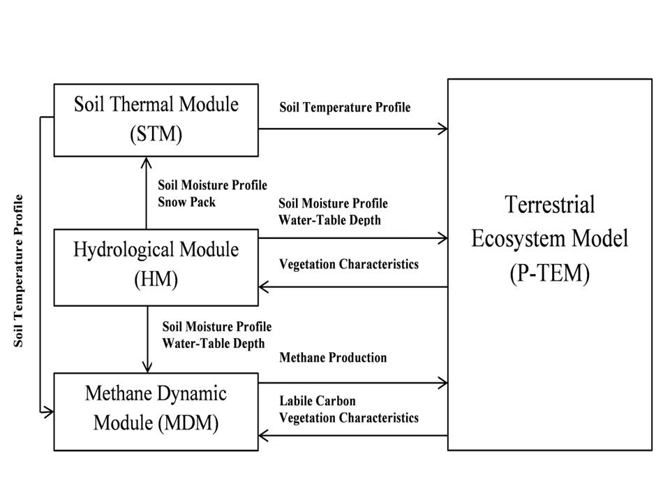 In this version of TEM, we integrated more effective algorithms of biogeochemistry after fire with the soil thermal dynamics simulated by STM and the hydrology simulated by HM. After fire, the STM and HM require information from TEM on how the thickness of moss and leaf area index change. Therefore, we modified TEM by including formulations to simulate changes in the thickness of moss, canopy biomass, and leaf area index as the stand recovers from disturbance. The TEM requires information from STM on soil temperature and from HM on soil moisture of the humic organic layer and on estimated actual evapotranspiration (EET). We modified TEM so that soil temperature and soil moisture of the humic organic soil layer influences the simulation of heterotrophic respiration, nitrogen mineralization, and nitrogen uptake by the vegetation. Similar to previous versions of TEM, EET influences the simulation of gross primary production (GPP) (Zhuang et al, 2002).